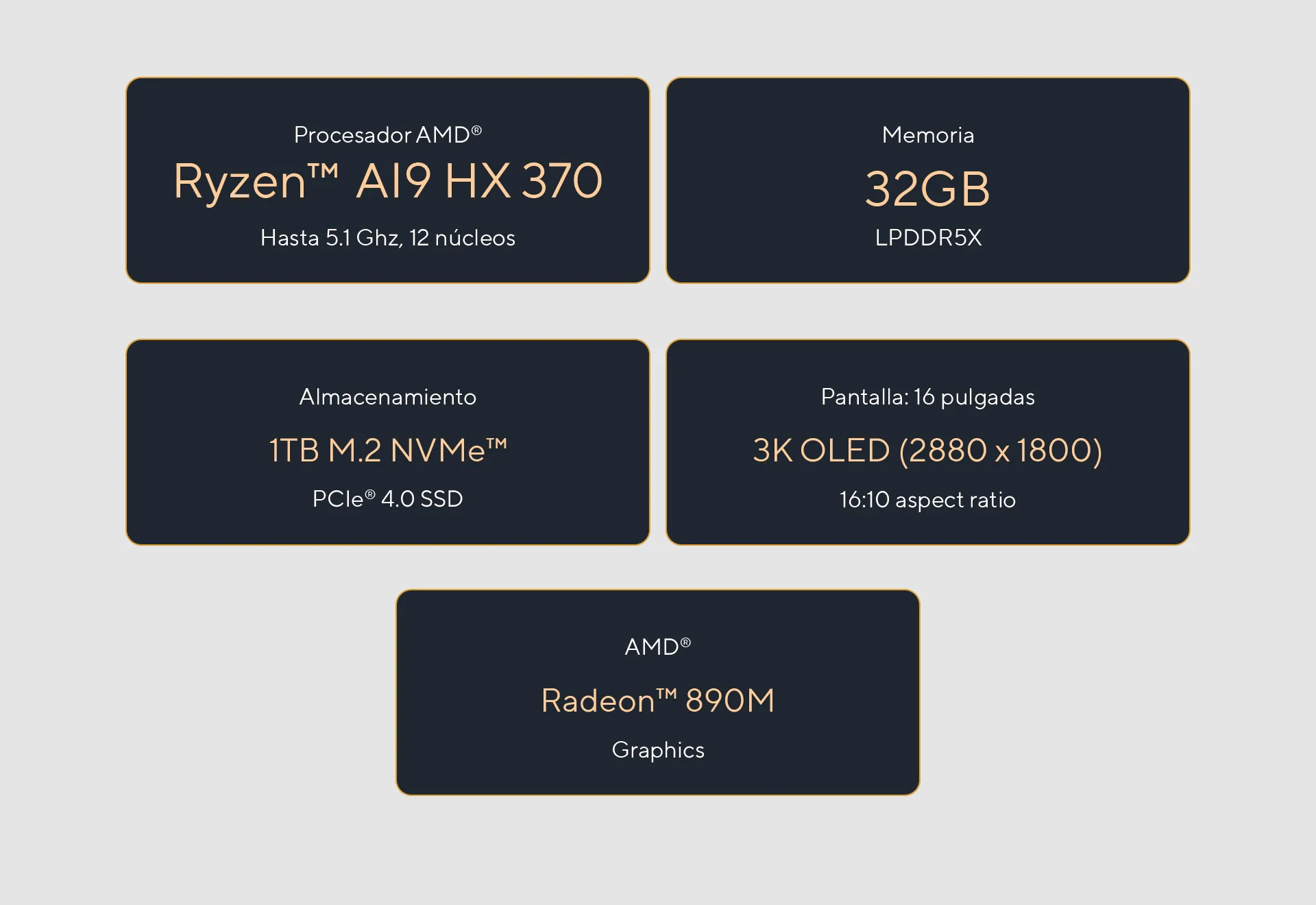 - Procesador: AMD Ryzen AI 9 HX 370 2.0GHz (36MB Cache, up to 5.1GHz, 12 cores, 24 Threads); AMD XDNA NPU up to 50TOPS