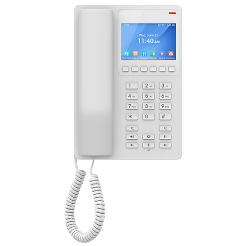 El Grandstream GHP630 es un teléfono IP hotelero compacto perfecto para el comercio en Colombia. Dispone de 2 cuentas/líneas SIP, conferencias de audio de 3 vías, pantalla color LCD de 3,5″ y 10 marcaciones rápidas más 6 teclas contextuales para atención eficiente. Ofrece audio HD, compatibilidad con audífonos (HAC) y puerto USB-C para carga de dispositivos. Se alimenta mediante PoE integrado, incluye seguridad empresarial (arranque seguro, cifrado AES) y se gestiona de forma centralizada con GDMS. Diseño elegante y funcional adaptable a recepción, clínicas, hoteles, bodegas y retail en Colombia.
